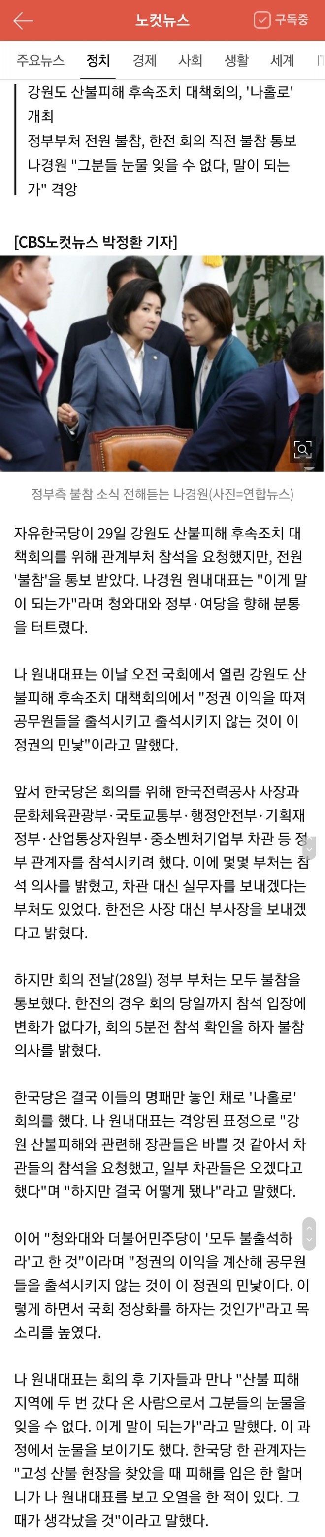 기사 제목 - 나경원, 산불대책회의 정부 전원 불참에 격앙 이녀는 지가 요구하면, 정부가 무조건 들어주고 그 사안에 대하여 무조건적으로 응해야 한다고 생각하는 것인지 참~ 나창아!!