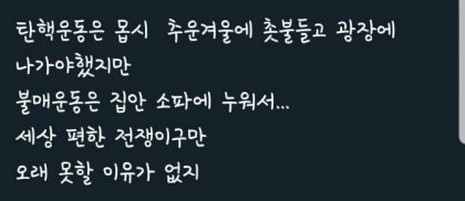 지난 촛불집회때 18번정도 참가했는데, 그중에 정말 3~4번은 정말 춥고 비오고 힘들었었지요.