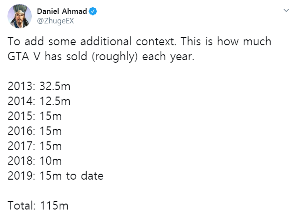 출시한지 7년째인데 아직도 한해에 1500만장이 팔림. 그러나 더 미친 게임도 있었으니 gta5보다 2년 먼저 출시한 마인 크래프트는 누계 1억7600만장이 팔림. 공식적으로 전세계에서 가장 많이 팔린 게임.