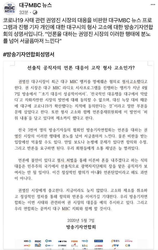 한국기자협회 대구MBC지회가 7일 자사 라디오 시사프로그램 앵커의 발언에 대해 언론중재위원회 제소와 검찰 고소로 대응한 대구시를 비판하는 성명을 냈다.