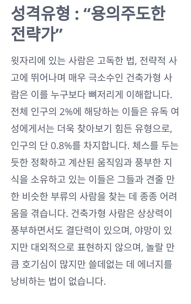 저도 본문과 비슷하게 나오네요. 용의주도한 전략가 INTJ-A 랩니다.