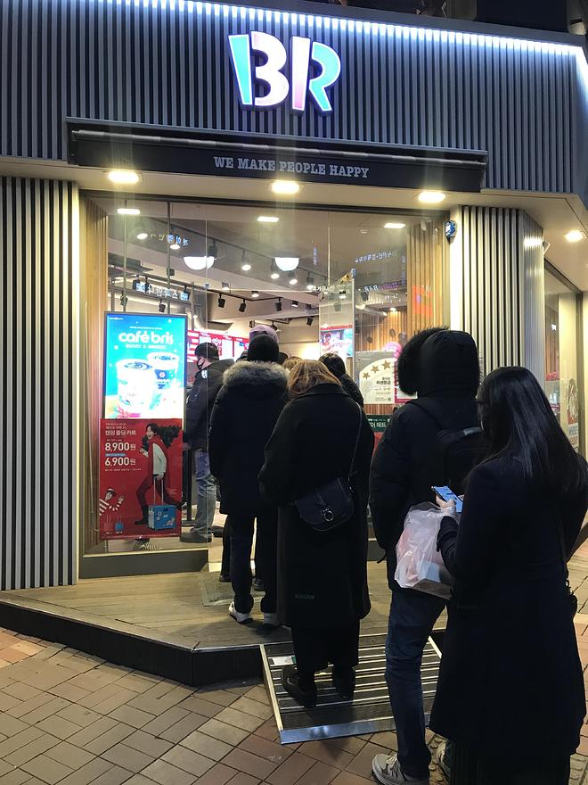 지금 베스킨라빈스의 매장 앞에서 줄을 서고 있습니다.