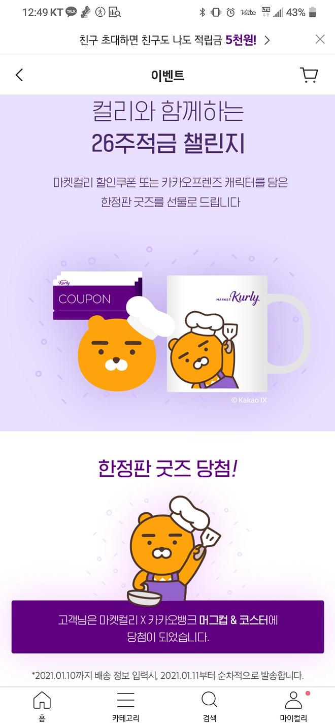 카뱅과 마켓컬리가 콜라보해서 출시한 26주 적금 이벤트를 진행했는데 한정판 굿즈에 당첨이 되었습니다. 내가? 진짜? 기대안하고 그냥 했는데 당첨됐네요. 총 3가지 중 한가지였는데 다른건 할인쿠폰들이었습니다. 당첨운 지지리도 없는 내가 당첨된거면 다주는거 아닌가라는 의구심도... 아무튼 머그컵과 코스터 이게 뭐라고 캐릭터 들어가 있으니 또 기분은 좋네요~ 혹시 당첨되신분 계신가요?