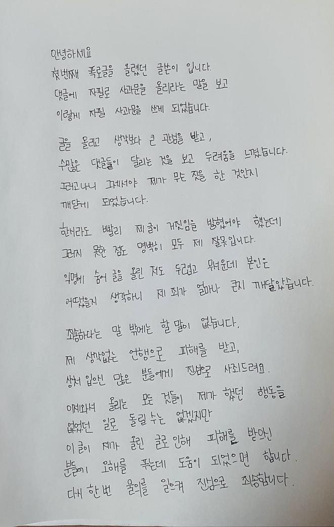 근데 자필 사과가 무슨 의미가 있다고.... 자필인지 대필인지 알 수 없잖아요