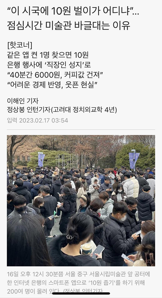오늘 뉴스 기사를 봤는데요 점심시간에 서울시립미술관앞에 사람이 바글바글 하대요. 같은 앱 켜서 1명 찾으면 10원. 저도 토스로 가끔 떠서 하긴 하는데 여기에 가면 30분동안 해서 커피값이 나오나봐요? 이 기사에서 말하는 은행 앱은 뭐죠..? 뭔지 아시는 분...? 이 근처 직장인들 점심 시간마다 재밌겠어요ㅋㅋ