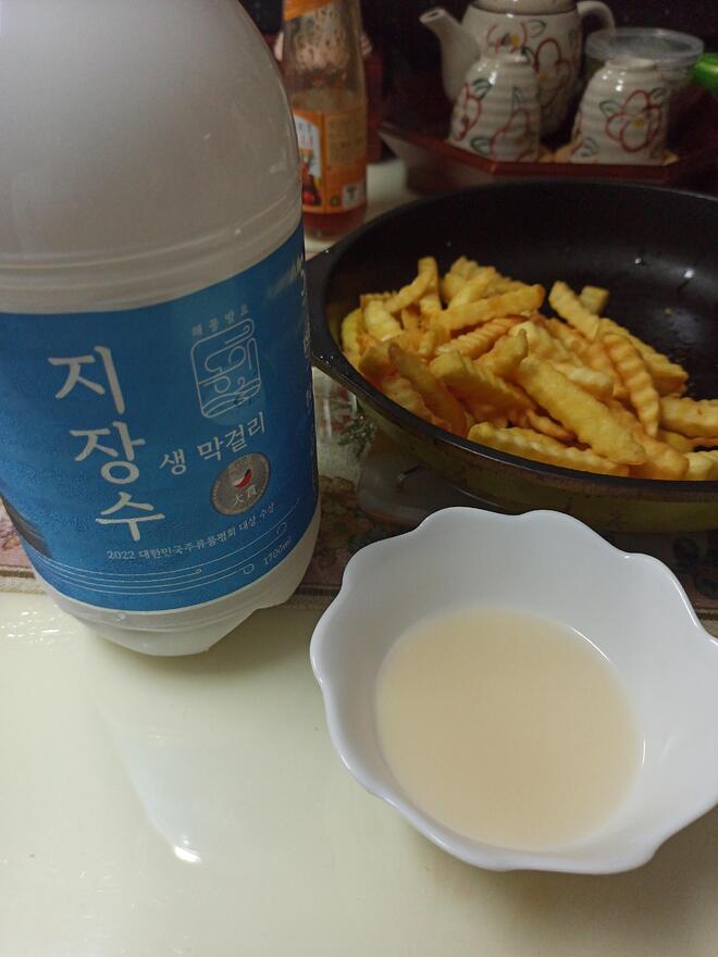 동네 마트에 장 보러 갔는데, 새로운 막걸리가 보여서 한 병사고, 안주로 뭘 먹을까? 하다가, 감자튀김 보여서 한 봉지 사다가, 저녁 대용으로 튀겨서... 한 잔 합니다. 강원도 동해시 막걸리인데, 맛은 좀 평이하네요. ㅎㅎ