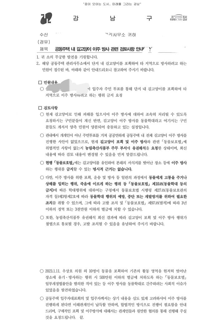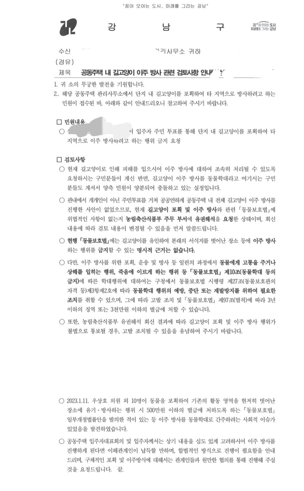 주민들은 길고양이와 켓맘들 때문에 투표까지 했고 신체적인 피해까지 당하고 재산상 피해도 봤는데 기껏 구청에서 이주방사에 대한 민원에 답변이라고 내놓은게 아주 가관입니다.