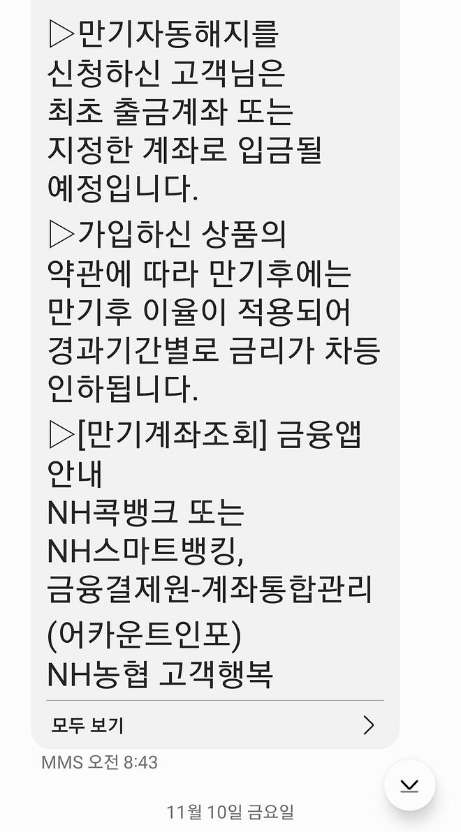 작년 가을쯤 한참 시중은행들 예금이자가 좋았잖아요? 그래서 국민은행에 1천만원짜리 정기예금을 들었고 12월 8일이 만기인데 이런 메시지가 오고 아까 전화로도 ARS상담사랍시고 안내멘트가 오던데요.