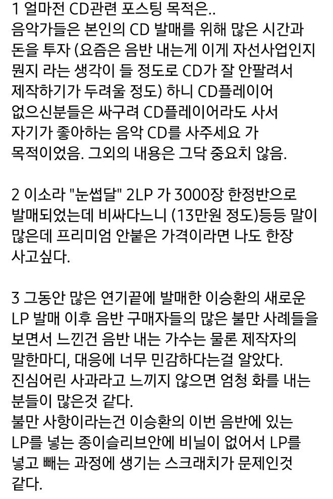 이렇게 글 일부만 잘라서 꼰대 운운하며 던져놓으시는 것은 아닌 듯합니다. 본문에도 언급된 이전 글도 있을테고. 다 떠나서 충분히 음반 제작자로서 개인 sns에 올릴 수 있는 글 같습니다. 공감하구요.