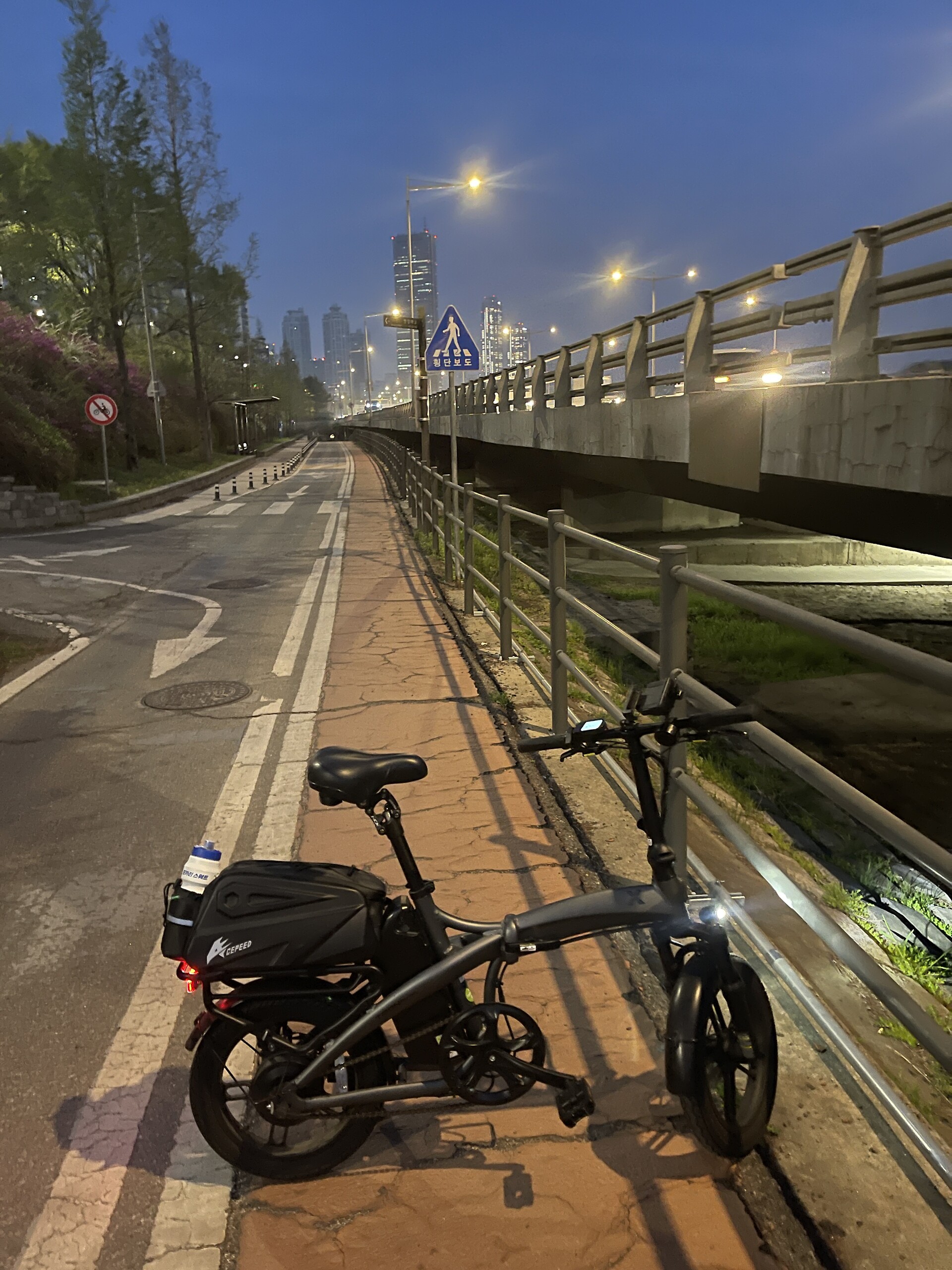 새벽 5시30분 한강대교 남단 자전거길에 제 자전거입니다.