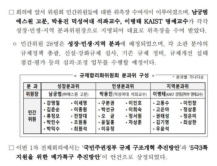 원래 총리와 민간위원중 1인이 공동 위원장이었는데 위원장을 대통령으로 부위원장을 여러명으로 했습니다. 이중에 정치인인 박용진 전 위원이 부위원장이자 민생분과위원장이 되었더군요. 성장분과위원회와 지역분과위원회가 또 있습니다. 새정부 규제개혁분야에서 제대로된 성과가 있기를 바랍니다.